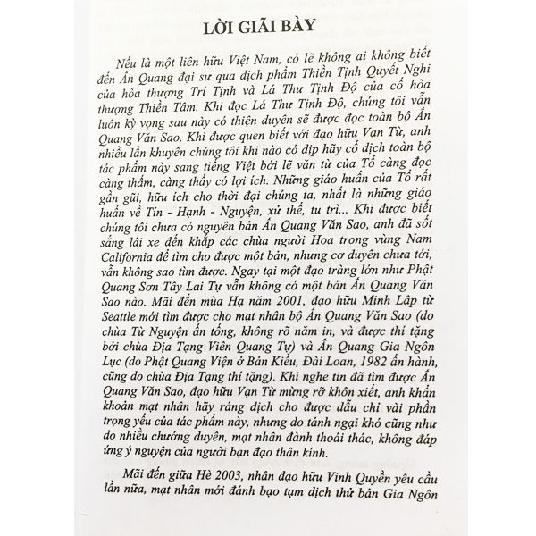 Nếu là một liên hữu Việt Nam, có lẽ không ai không biết đến Ấn Quang Đại Sư qua dịch phẩm Thiền Tịnh Quyết Nghi của Hòa Thượng Trí Tịnh và Lá Thư Tịnh Độ của cố Hòa Thượng Thiền Tâm. Khi đọc Lá Thư Tịnh Độ, chúng tôi vẫn luôn kỳ vọng sau này có thiện duyên sẽ được đọc toàn bộ Ấn Quang Văn Sao. Khi được quen biết với đạo hữu Vạn Từ, anh nhiều lần khuyên chúng tôi khi nào có dịp hãy cố dịch toàn bộ tác phẩm này sang tiếng Việt bởi lẽ văn từ của Tổ càng đọc càng thấm, càng thấy có lợi ích. Những giáo huấn của Tổ rất gần gũi, hữu ích cho thời đại chúng ta, nhất là những giáo huấn về Tín Hạnh Nguyện, xử thế, tu trì,… Khi được biết chúng tôi chưa có nguyên bản Ấn Quang Văn Sao, anh đã sốt sắng lái xe đến khắp các Chùa người Hoa trong vùng Nam California để tìm cho được một bản, nhưng cơ duyên chưa tới, vẫn không sao tìm được. Ngay tại một Đạo Tràng lớn như Phật Quang Sơn Tây Lai Tự vẫn không có một bản Ấn Quang Văn Sao nào. Mãi đến mùa Hạ năm 2001, đạo hữu Minh Lập từ Seattle mới tìm được cho mạt nhân bộ Ấn Quang Văn Sao (do Chùa Từ Nguyện ấn tống, không rõ năm in, và được thí tặng bởi Chùa Địa Tạng Viên Quang Tự) và Ấn Quang Gia Ngôn Lục (do Phật Quang Viện ở Bản Kiều, Đài Loan, 1982 ấn hành, cũng do Chùa Địa Tạng thí tặng). Khi nghe tin đã tìm được Ấn Quang Văn Sao, đạo hữu Vạn Từ mừng rỡ khôn xiết, anh khẩn khoản mạt nhân hãy ráng dịch cho được dẫu chỉ vài phần trọng yếu của tác phẩm này, nhưng do tánh ngại khó cũng như do nhiều chướng duyên, mạt nhân đành thoái thác, không đáp ứng ý nguyện của người bạn đạo thân kính.
