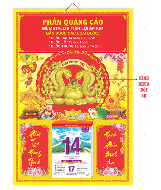 Bộ Lịch Bloc Đại(2025) + Bìa Đại Ván Ép In Metaline Size 40 X 60cm . DÁN CHỮ NHỰA 3D - Phong Thuỷ Đón Xuân HBT177