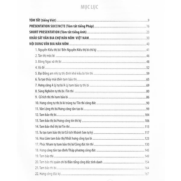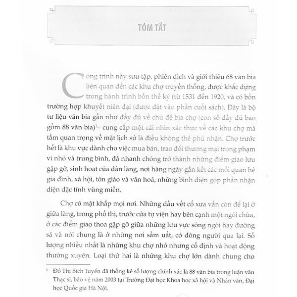 "Chỉ tiêu đòi hỏi hiến tặng, hiến tặng sinh ra nhu cầu lập bia, văn bia cung cấp cứ liệu lịch sử. Quy trình này phản ánh rõ nét qua tư liệu văn bia về các khu chợ truyền thống của Việt Nam. Công trình này sưu tập, phiên dịch và giới thiệu 68 văn bia liên quan đến các khu chợ truyền thống, được khác dựng trong hành trình bốn thế kỳ (từ 1531 dến 1920).Đây là bộ tư liệu nguyên cấp khá đầy đủ về chủ đề bia chợ Việt Nam, cung cấp một cái nhìn xác thực về các khu chợ mà tầm quan trọng về mặt lịch sử là điều không thể phủ nhận. Chợ là hình ảnh quen thuộc đối với tất cả mọi người, có mặt ở khắp các thôn làng, phố thị, là khu vực vốn dành cho việc mua bán, trao đổi thương mại, nhưng ở các thôn làng, chúng đã nhanh chóng trở thành điểm giao lưu gặp gỡ, sinh hoạt thường nhật của người dân, nối kết các mối quan hệ gia đình, xã hội, tôn giáo và văn hoá, những bình diện giúp chúng ta nhận diện rõ nét hơn về đặc tính vùng miền của Việt Nam." -