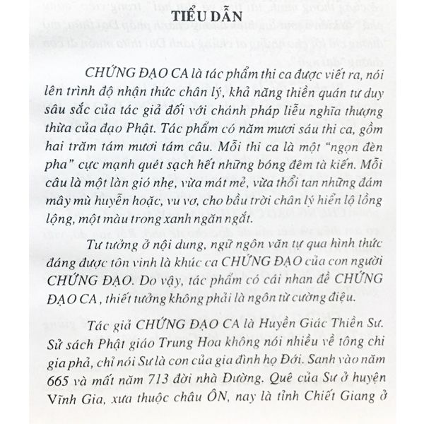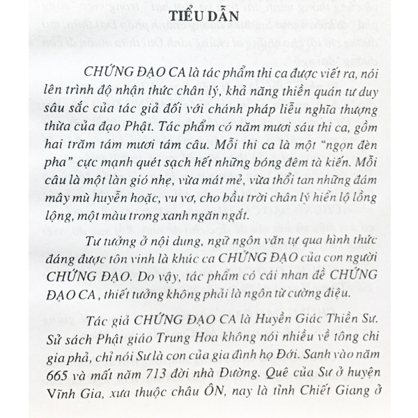 Tư tưởng ở nội dung, ngữ ngôn văn tự qua hình thức đáng được tôn vinh là khúc ca CHỨNG ĐẠO của con người CHỨNG ĐẠO. Do vậy, tác phẩm có cái nhan đề CHỨNG ĐẠO CA, thiết tưởng không phải là ngôn từ cường điệu.