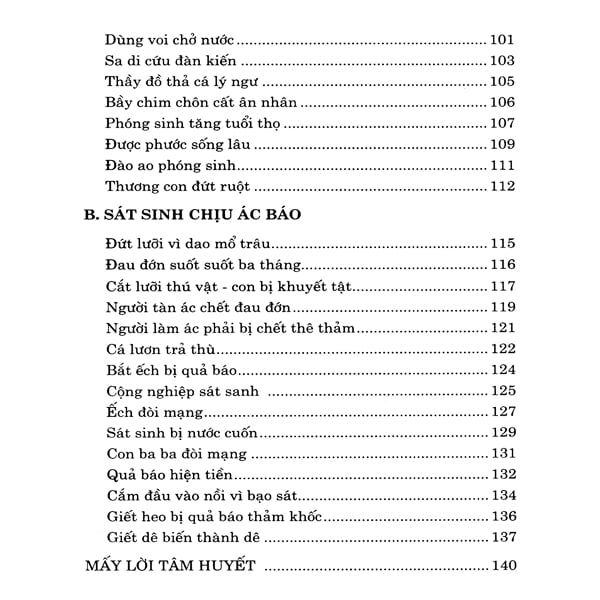 Qua những lời giảng giải và những câu chuyện có xưa, có nay, hội đủ các yếu tố cổ kim, tác giả hy vọng có thể giúp cho tất cả mọi người đều thấy rõ đựơc giá trị của việc cứu vật phóng sinh cũng như sự nguy hại của việc giết hại sinh mạng mà sớm có một sự chuyển hướng tốt đẹp trong đời sống.