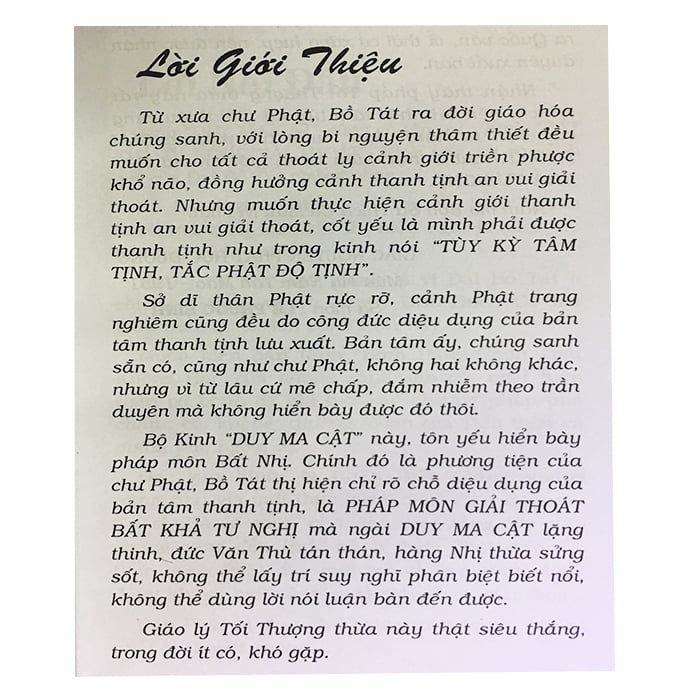 Kinh "DUY MA CẬT" cũng có tên gọi: Kinh "BẤT KHẢ TƯ NGHỊ GIẢI THOÁT". Kinh này nói rõ cảnh giới của Đại Bồ Tát chứng nhập.Bồ Tát thường chẳng những thị hiện thuận hành mà cũng lắm khi thị hiện nghịch hành để hóa độ chúng sinh.Ngài DUY MA CẬT chính là vị Đại Bồ Tát ở cõi Bất Động, vì trợ duyên đức Thích Ca mà hiện thân cư sĩ đến cõi Ta bà này.Muốn hiển bản tánh "Bình Đẳng Chơn Thật Không Hai" của chúng sinh sẵn có, Ngài hiện thân có bịnh để chỉ bày các phương pháp phá chấp: có, không, thường, đoạn của Tiểu Thừa và phàm phu ngoại đạo.Đọc vào kinh ta nhận thấy chẳng những hàng xuất gia mới thật hành được Phật đạo, mà Cư sĩ, Bà la môn cho đến mọi tầng lớp dân chúng cũng đều thật hành được Phật đạo. Có thật hành Phật đạo mới trở về bản tánh "bình đẳng không hai" và đầy đủ diệu dụng giải thoát.Đạo Phật là đạo chú trọng thật hành, không phải lý thuyết suông.Bộ Kinh DUY MA CẬT đây hiển rõ rành mạch cả lý thuyết và chỗ thật hành cho đến thế nào là thân chứng. Càng đọc, càng gẫm, càng thật hành, ta sẽ thấy đầy tánh cách từ bi vô ngại rộng lớn bao la của tâm hồn lợi tha triệt để.Đời đang đắm chìm trong biển khổ mênh mang, người muốn cứu đời chân chính, cần phải có phương pháp chân chính cao siêu. Thấy sự lợi ích của kinh này hướng dẫn mọi người đi đến mục đích cao cả, thoát hẳn muôn sự mê lầm đen tối của tâm hồn chấp trước, ích kỷ, nhỏ hẹp và hành vi khổ lụy nhơn sinh, Dịch giả chẳng nệ gì chỗ hiểu chưa cùng tột và hạnh đức chưa thân chứng đến cảnh giới "bất tư nghị" mà vội cống hiến cho bạn đọc một pho sách chưa từng có.Vậy có chỗ nào sơ sót mong các bực cao minh phủ chính cho. Rất thâm tạ!