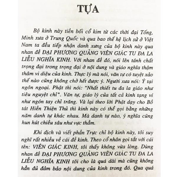VIÊN GIÁC KINH, tôi thấy không vừa lòng. Dùng nhan đề ĐẠI PHƯƠNG QUẢNG VIÊN GIÁC TU ĐA LA LIỄU NGHĨA KINH tôi cho là quá dài mà cũng không hẳn đủ đảm bảo nội dung của kinh trong đó. Qua quá trình tư duy dai dẳn tôi vụt nhớ hai câu thơ của một thiền sư Việt nam: