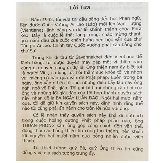 Trong khi đi tàu từ Savannakhet đến Vientiane để lãnh bằng, tôi được duyên may gặp một vị thiện nam cùng gia quyến cũng đi dự lễ. Ông thiện nam ấy biết tôi là người Việt, có lòng tốt hỏi thăm sức khỏe tôi và nhơn vui miệng có bàn qua vấn đề Phật pháp. Luôn trong ba ngày, ông vẫn ở bên tôi, hỏi những điều bấy lâu nay ông nghi ngờ về Phật giáo. Tôi ghi lại tỉ mỉ những câu hỏi của ông và những lời giải đáp của tôi họp thành quyển sách này, nhan đề là BA NGÀY LUẬN ÐẠO. Ngót hai mươi năm qua, tôi đã giữ kín quyển sách này, đinh ninh rằng thế nào tôi cũng phải ấn hành cho tròn lời hứa với ông.