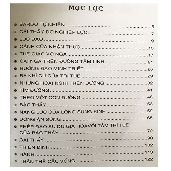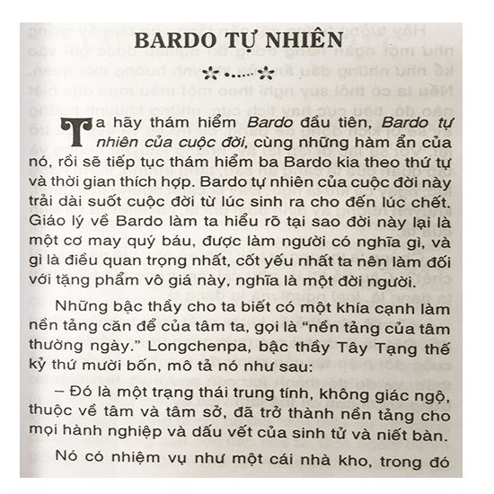 "Ta hãy thám hiểm Bardo đầu tiên, Bardo tự nhiên của cuộc đời, cùng những hàm ẩn của nó, rồi sẽ tiếp tục thám hiểm ba Bardo kia theo thứ tự và thời gian thích hợp. Bardo tự nhiên của cuộc đời này trải dài suốt cuộc đời từ lúc sinh ra cho đến lúc chết. Giáo lý về Bardo làm ta hiểu rõ tại sao đời này lại là một cơ may quý báu, được làm người có nghĩa gì, và gì là điều quan trọng nhất, cốt yếu nhất ta nên làm đối với tặng phẩm vô giá này, nghĩa là một đời người..."