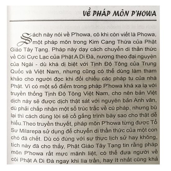Nhà Phật có vô lượng pháp môn, tùy nhân duyên nhiều đời, mỗi người sẽ tìm được pháp thích hợp. Riêng với Phật tử Việt Nam hiện nay, pháp môn Tịnh Độ phổ biến nhất, rồi sau đó mới tới Thiền tông. Sách này được dịch chỉ vì muốn giới thiệu người đang tu Tịnh Độ biết rằng bên Tây Tạng cũng có pháp gọi là P'howa, tuy nhiều dị biệt, nhưng cũng tìm về cõi Cực Lạc của Phật A Di Đà.