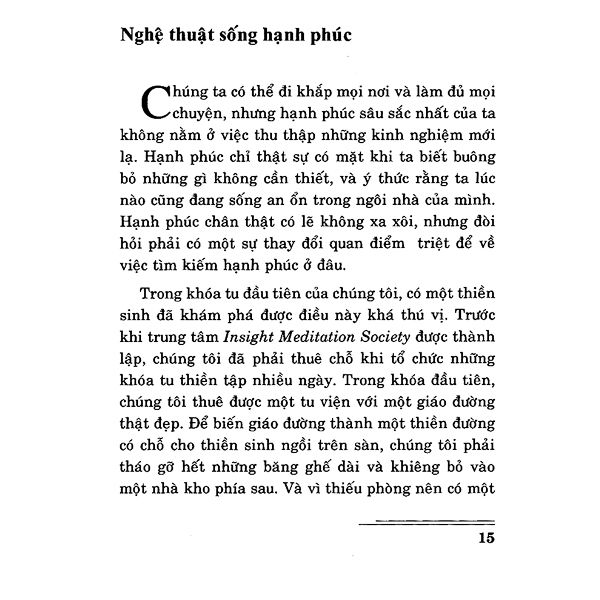 Sách này trình bày những kinh nghiệm và phương pháp tu tập mà bản thân tác giả đã học được qua nhiều năm theo đuổi tại Ấn Độ và Miến Điện. Là một trong những người sáng lập trung tâm thiền tập Insight Meditation Society tại Barre, Massachusetts, Hoa Kỳ, tác giả chia sẻ trong sách này rất nhiều kinh nghiệm quý giá đối với mọi thiền sinh.