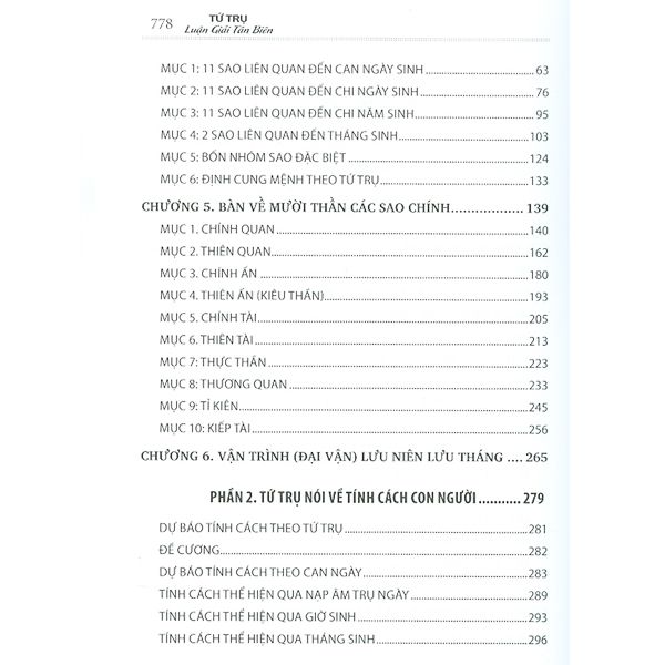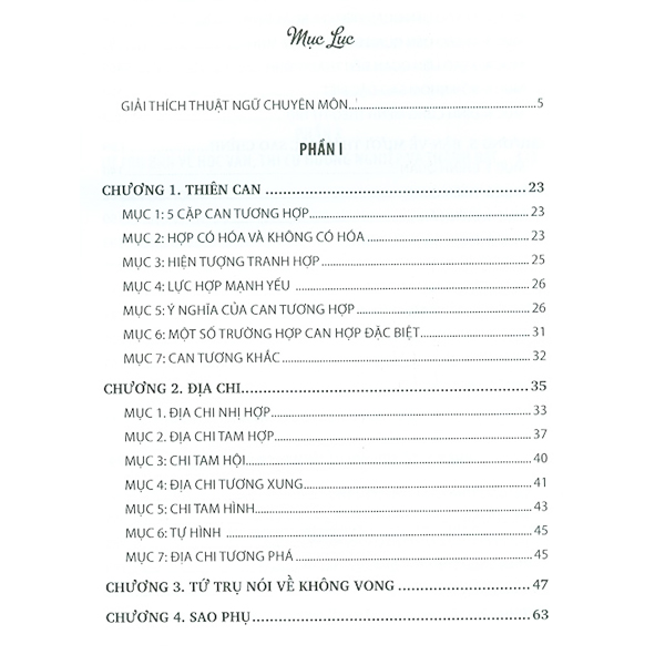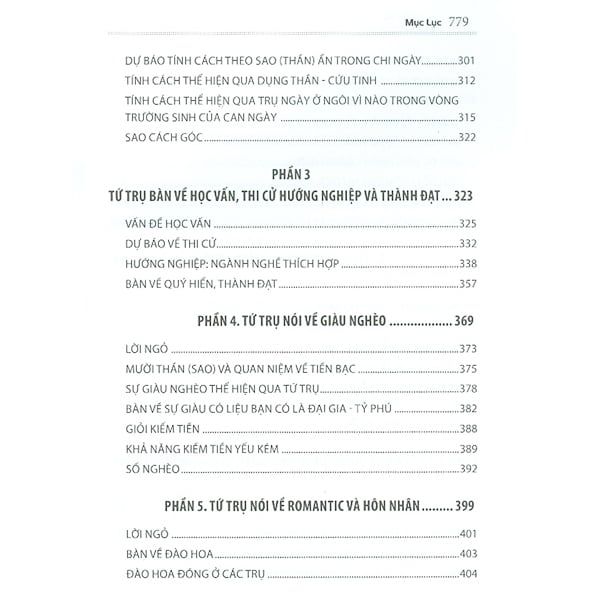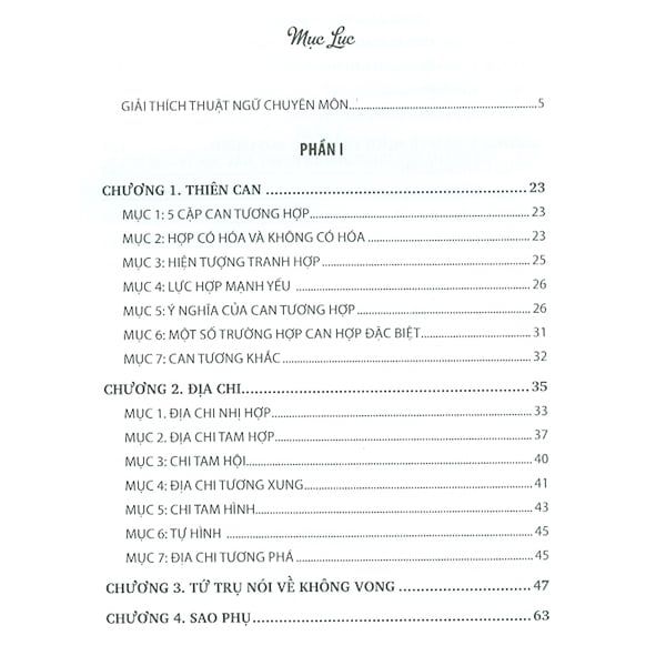 Giải thích thuật ngữ chuyên mônPhần 1: Tứ trụ nói về không vongPhần 2: Tứ Trụ nói về tính cách con ngườiPhần 3: Tứ trụ nói về học vấn, thi cử hướng nghiệp và thành đạtPhần 4: Tứ trụ nói về giàu nghèoPhần 5: Tứ trụ nói về romantic và hôn nhânPhần 6: Tứ trụ nói về cách - cụcPhần 7: Tứ trụ ứng dụng cho doanh nhân và doanh nghiệp